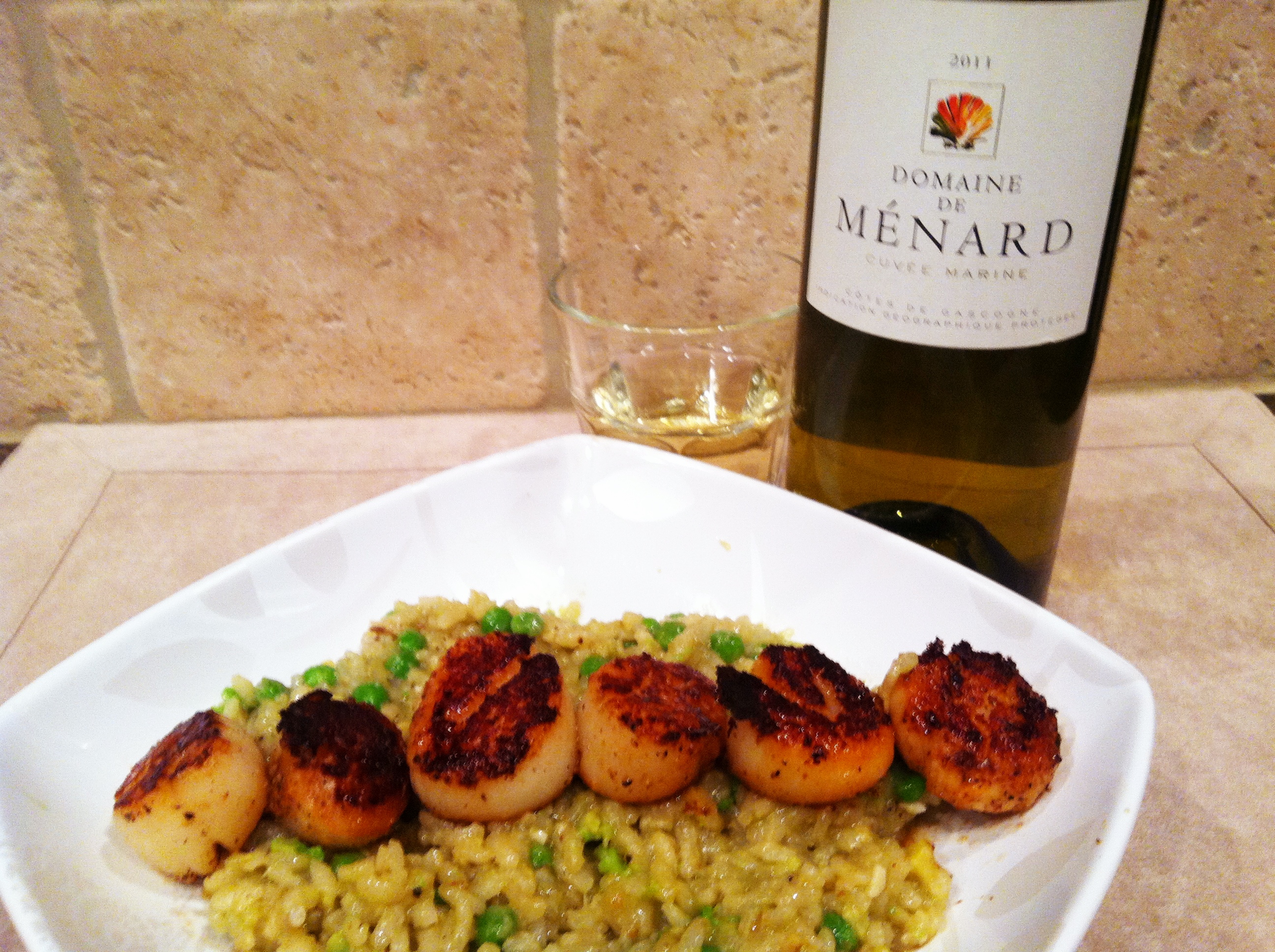 I thought that this wine might go well with something buttery to soften the sharpness and the tang, so I decided to make Pan Seared Scallops with an Avocado and Peas Risotto. Unfortunately, I was wrong… it was better as two separate entities.
