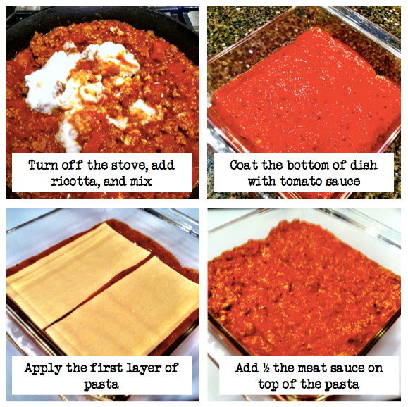 - In a 6 x 6 inch wide baking dish, pour 1/4 cup of tomato sauce at the bottom, spread to cover the pan (this layer of sauce will provide moisture to the first layer of pasta, cooking it and keeping it from sticking to the bottom of the pan)
