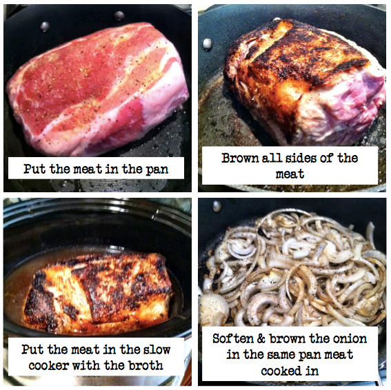 - Once all the sides of the pork shoulder are browned, move it into the slow cooker (or large pot).